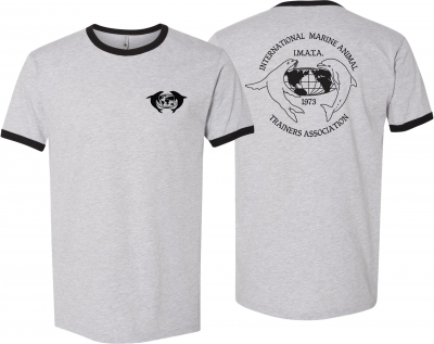Grey/black ringer t-shirt. Front: small IMATA logo on left chest. Back: large original IMATA logo.
