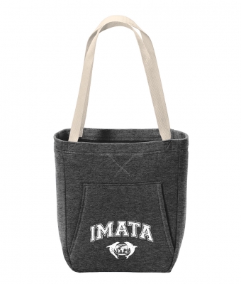 Dark heather gray fleece sweatshirt tote with IMATA collegiate logo in white.